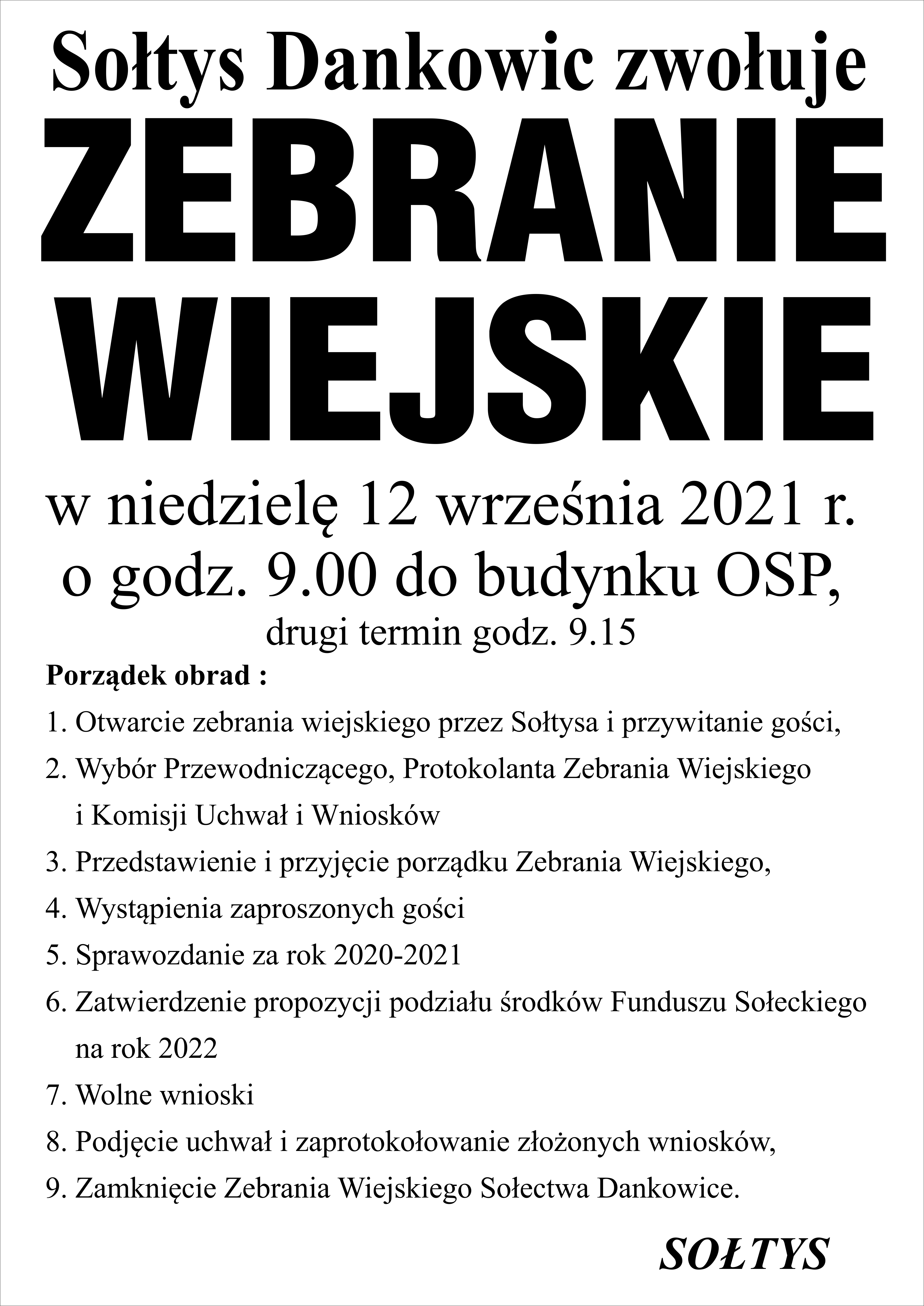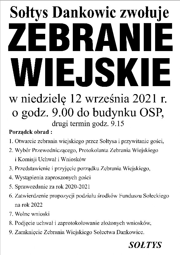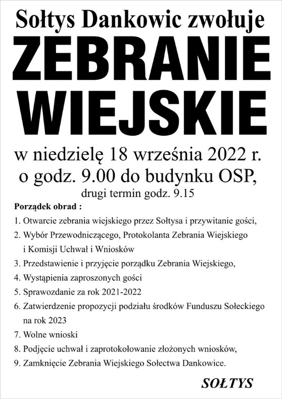 O zwołaniu Zebrania Wiejskiego na dzień 18.09. br. mieszkańcy Sołectwa Dankowice zostali powiadomieni przez Sołtysa w formie zawiadomień umieszczonych w miejscach publicznych zwyczajowo przyjętych dla tego rodzaju spraw, na stronie internetowej Sołectwa oraz zostało odczytane na prośbę Sołtysa w kościele parafialnym, w terminie określonym w § 14 ust. 2 Statutu Sołectwa Dankowice.