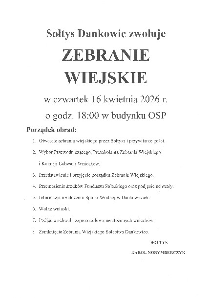 O zwołaniu Zebrania Wiejskiego na dzień 18.09. br. mieszkańcy Sołectwa Dankowice zostali powiadomieni przez Sołtysa w formie zawiadomień umieszczonych w miejscach publicznych zwyczajowo przyjętych dla tego rodzaju spraw, na stronie internetowej Sołectwa oraz zostało odczytane na prośbę Sołtysa w kościele parafialnym, w terminie określonym w § 14 ust. 2 Statutu Sołectwa Dankowice.